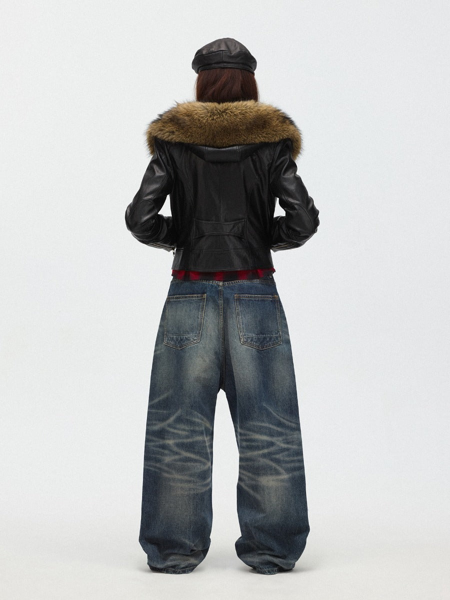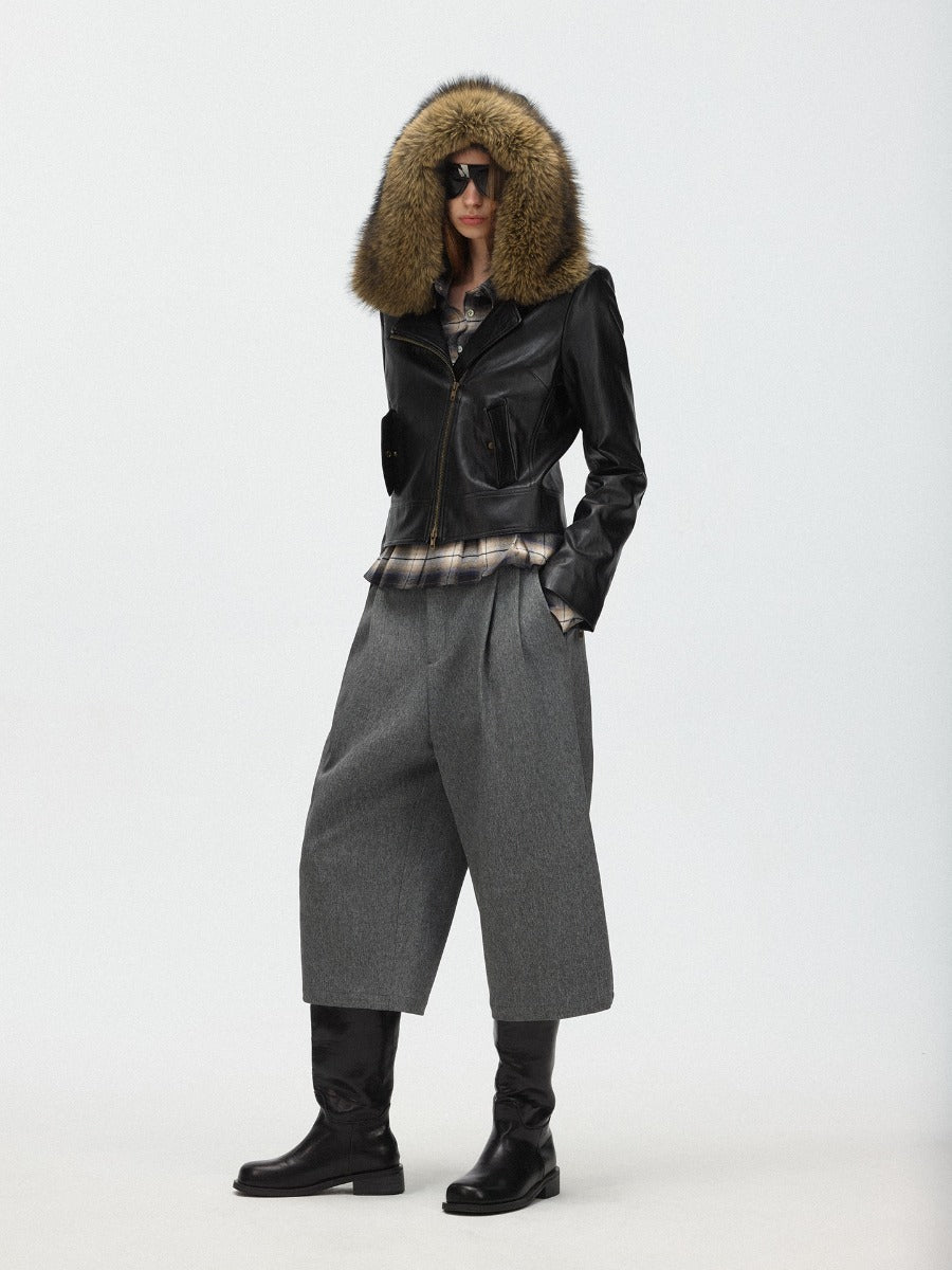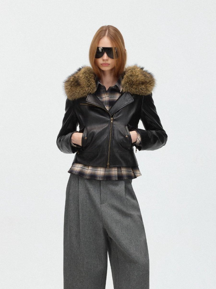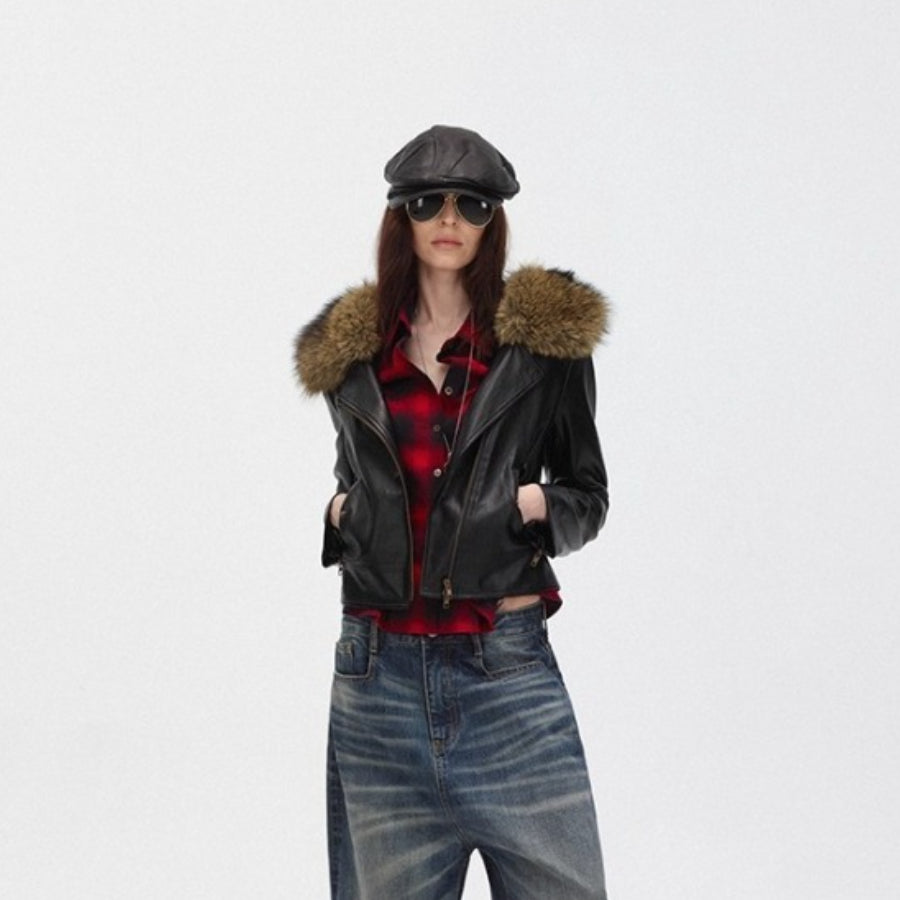 Faux Fur Hooded Slim Fit Moto Leather Jacket