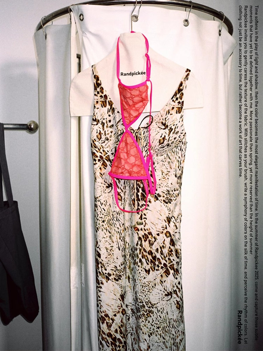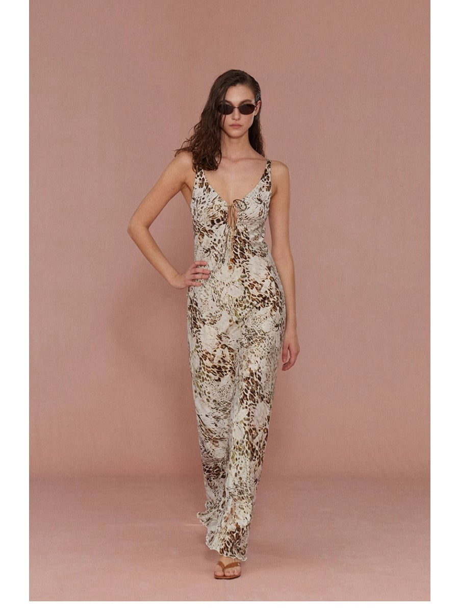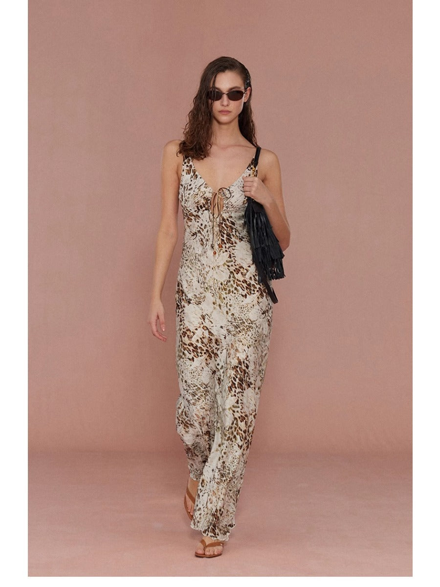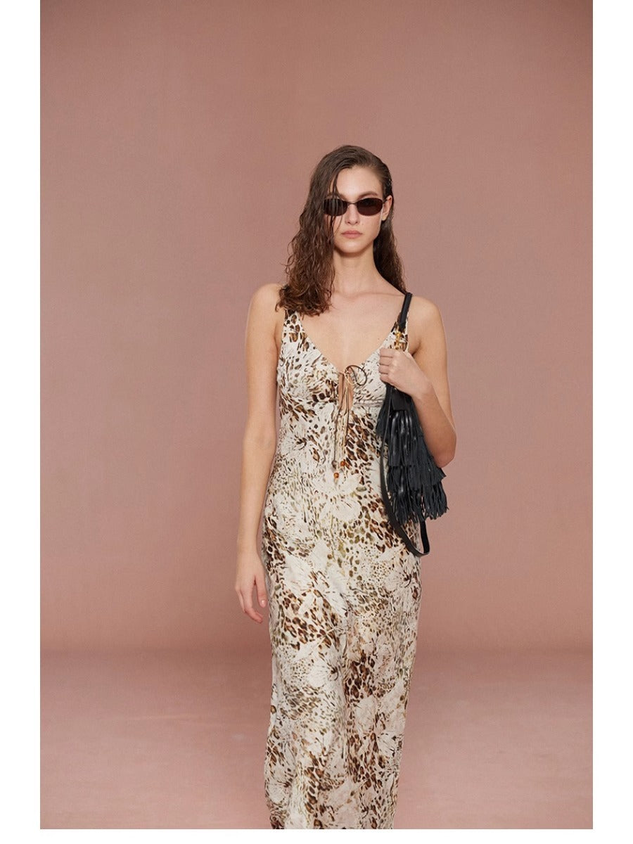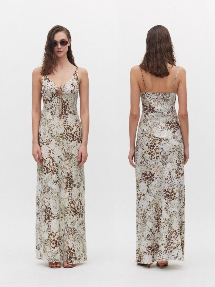 Holiday Collection - Leopard Satin Tie Strap Beaded Cami Maxi Dress