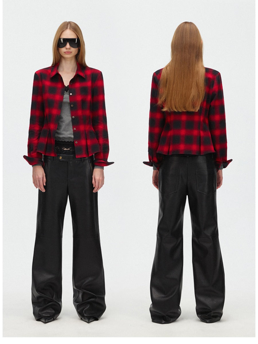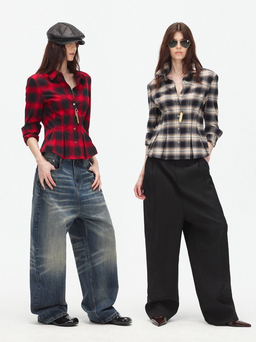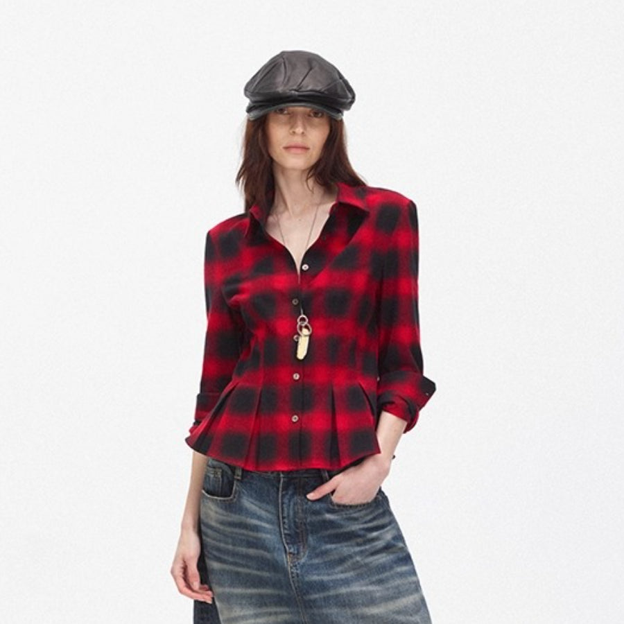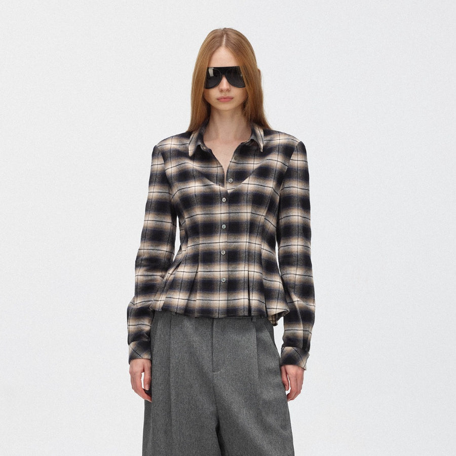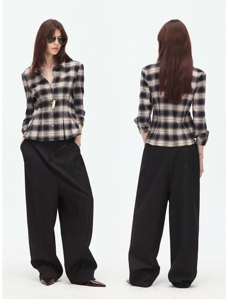 Plaid Pleated Waist Slim Fit Long Sleeve Shirt