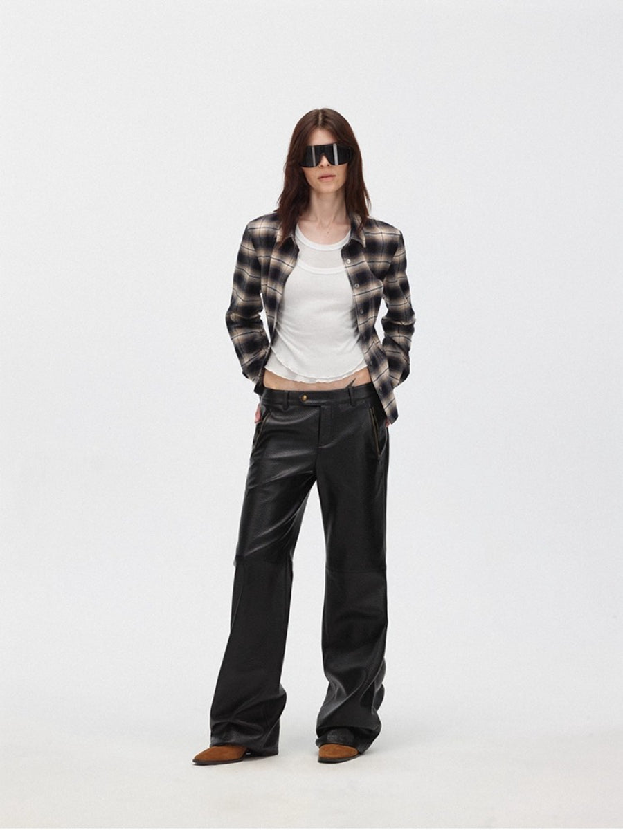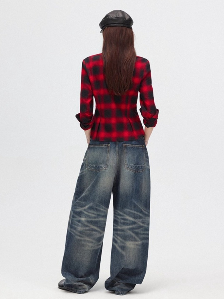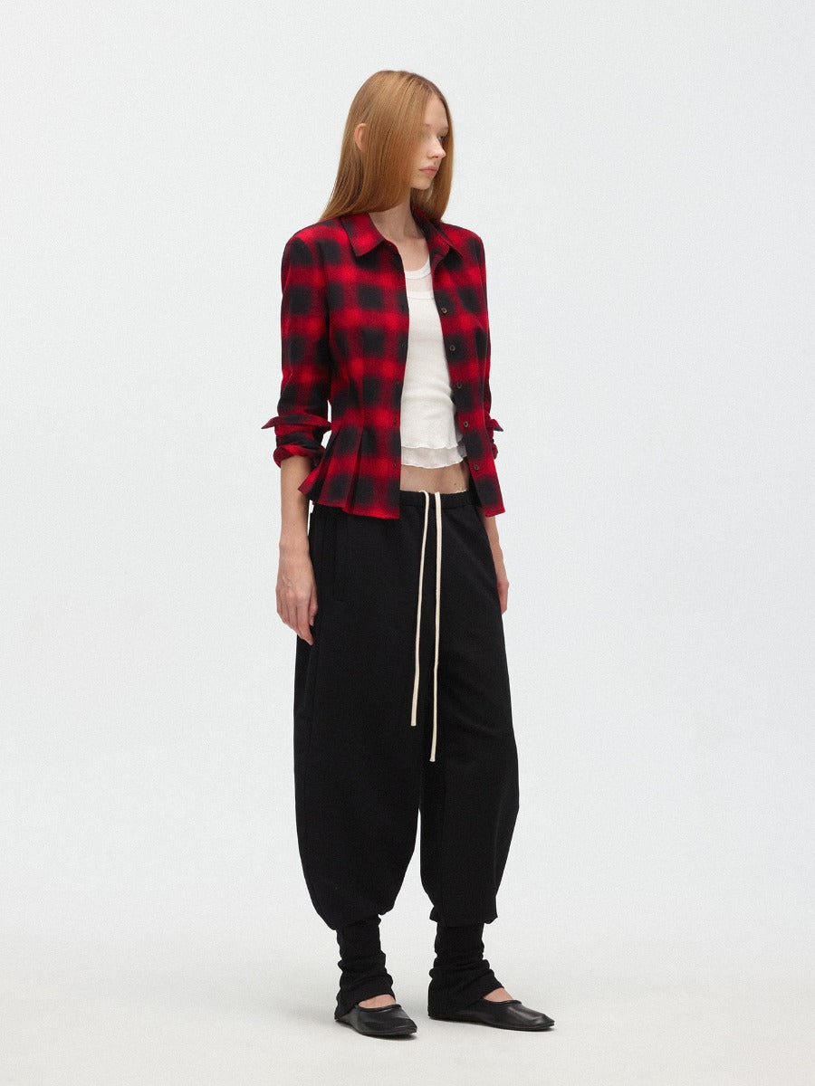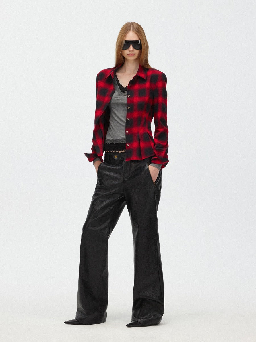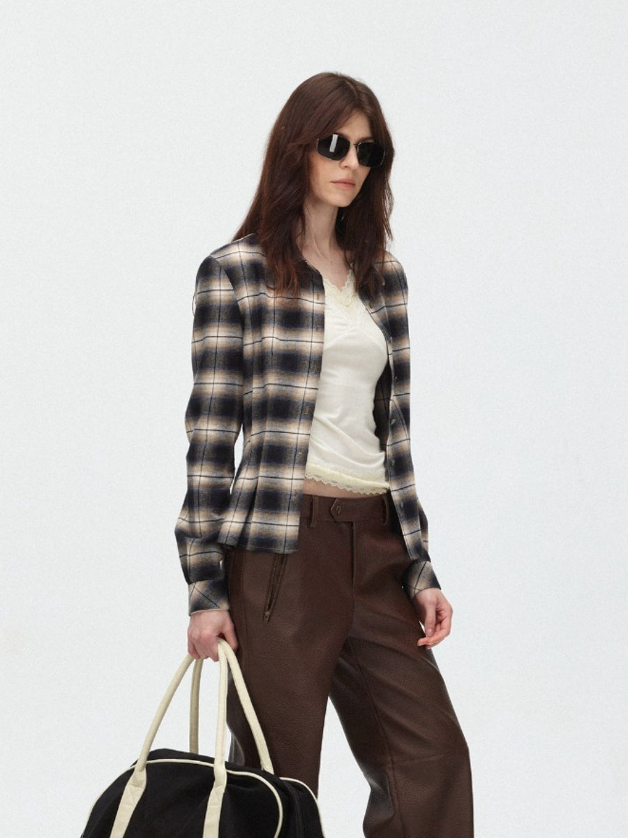 Plaid Pleated Waist Slim Fit Long Sleeve Shirt