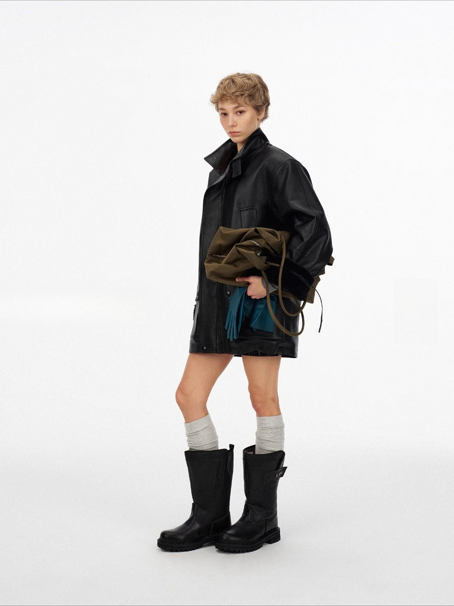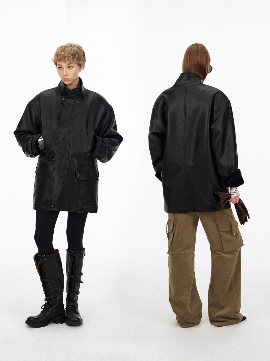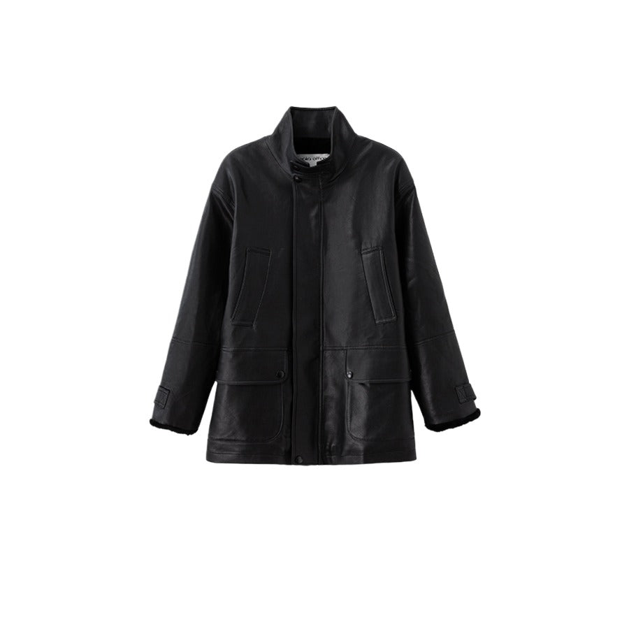Retro H-shaped Mid-length Stand-up Collar PU Leather Jacket「NEW」