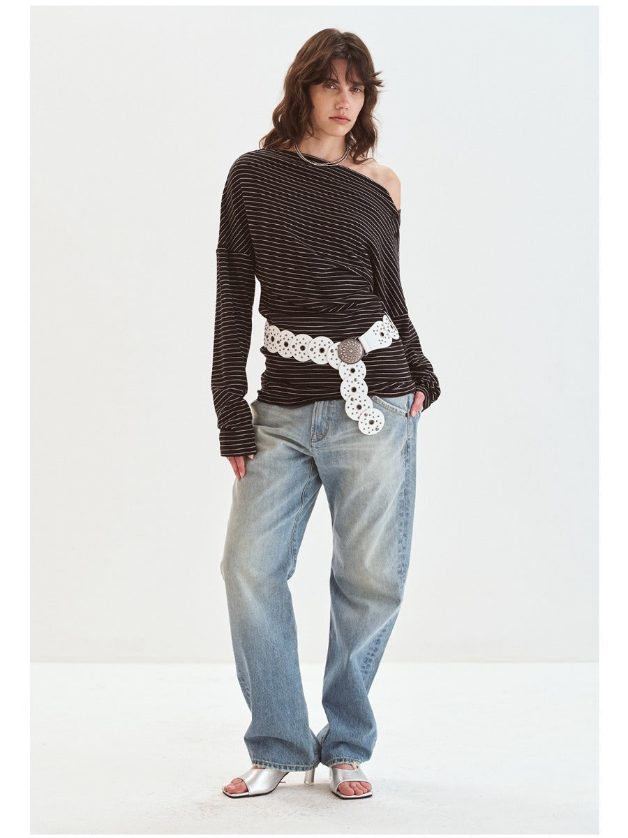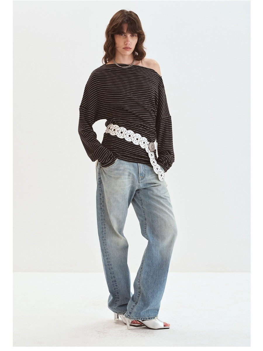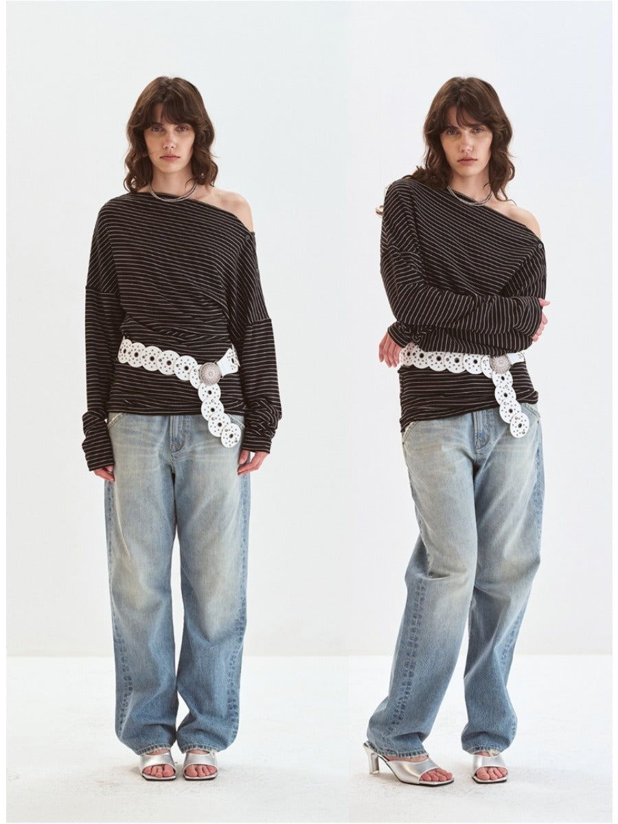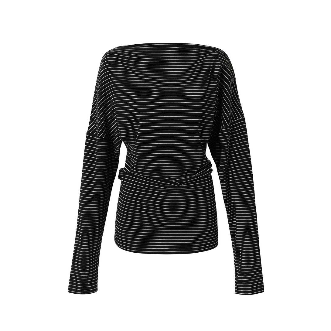 Striped Off Shoulder Shell Button Knit Top「NEW」