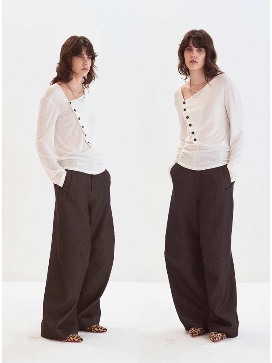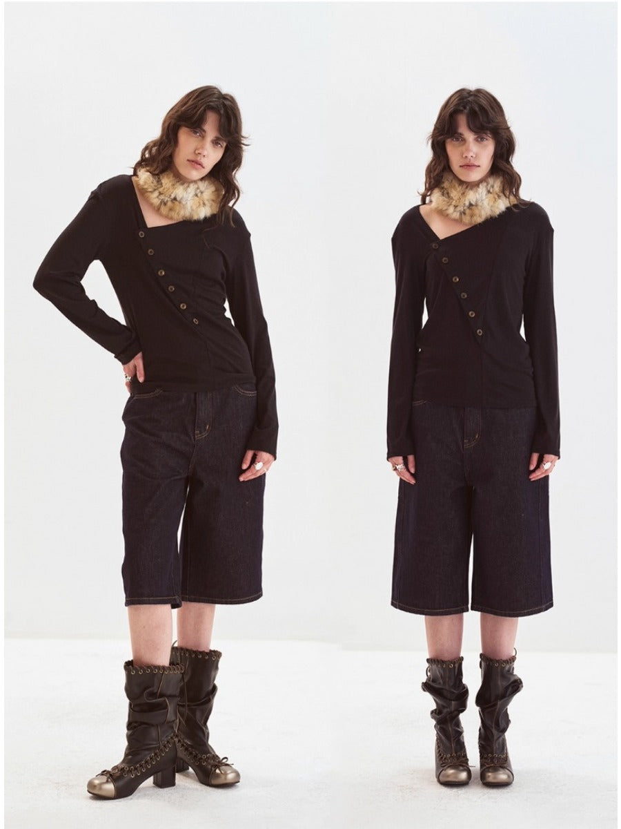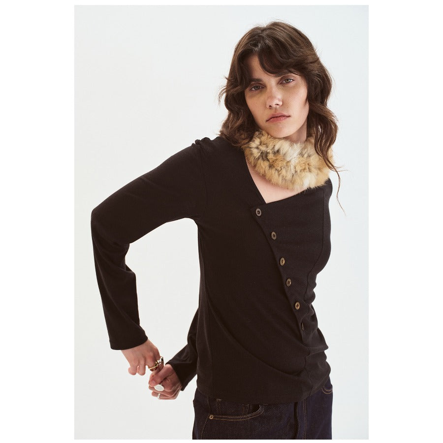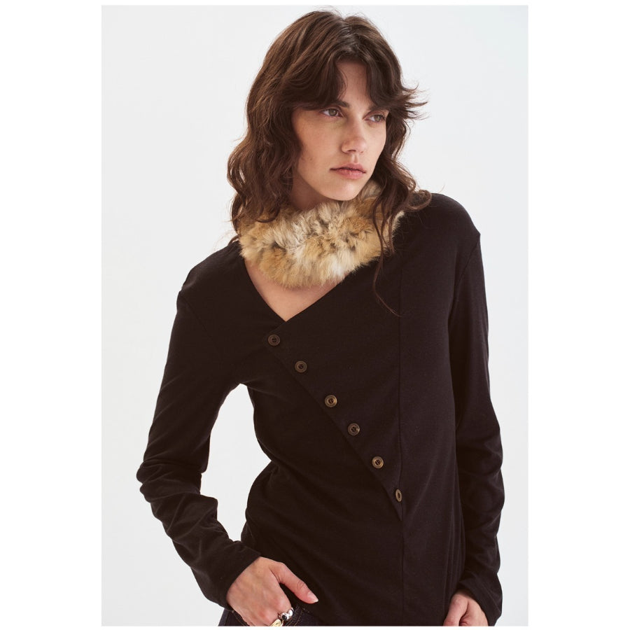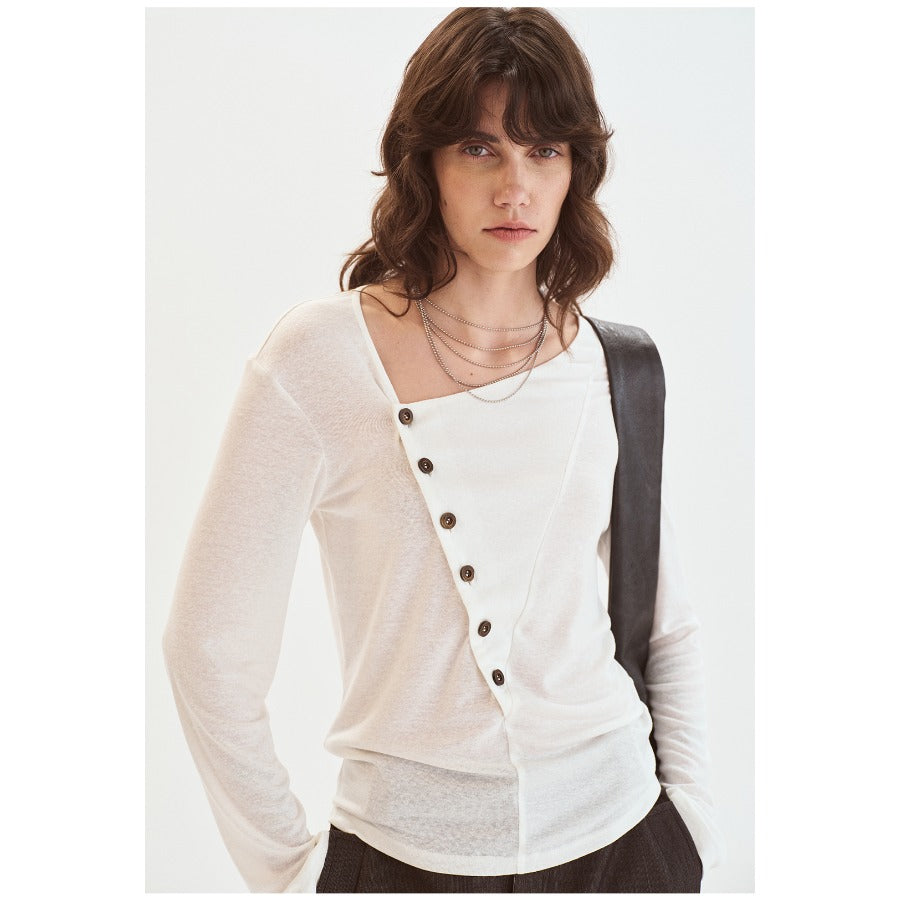 Vintage Tencel Linen Textured Irregular Horn Button Knit Top