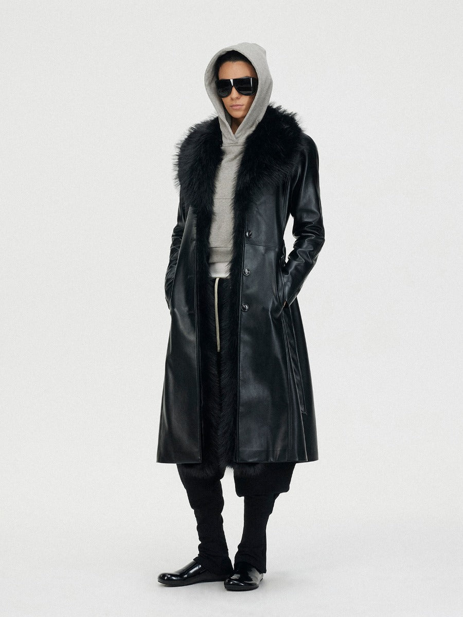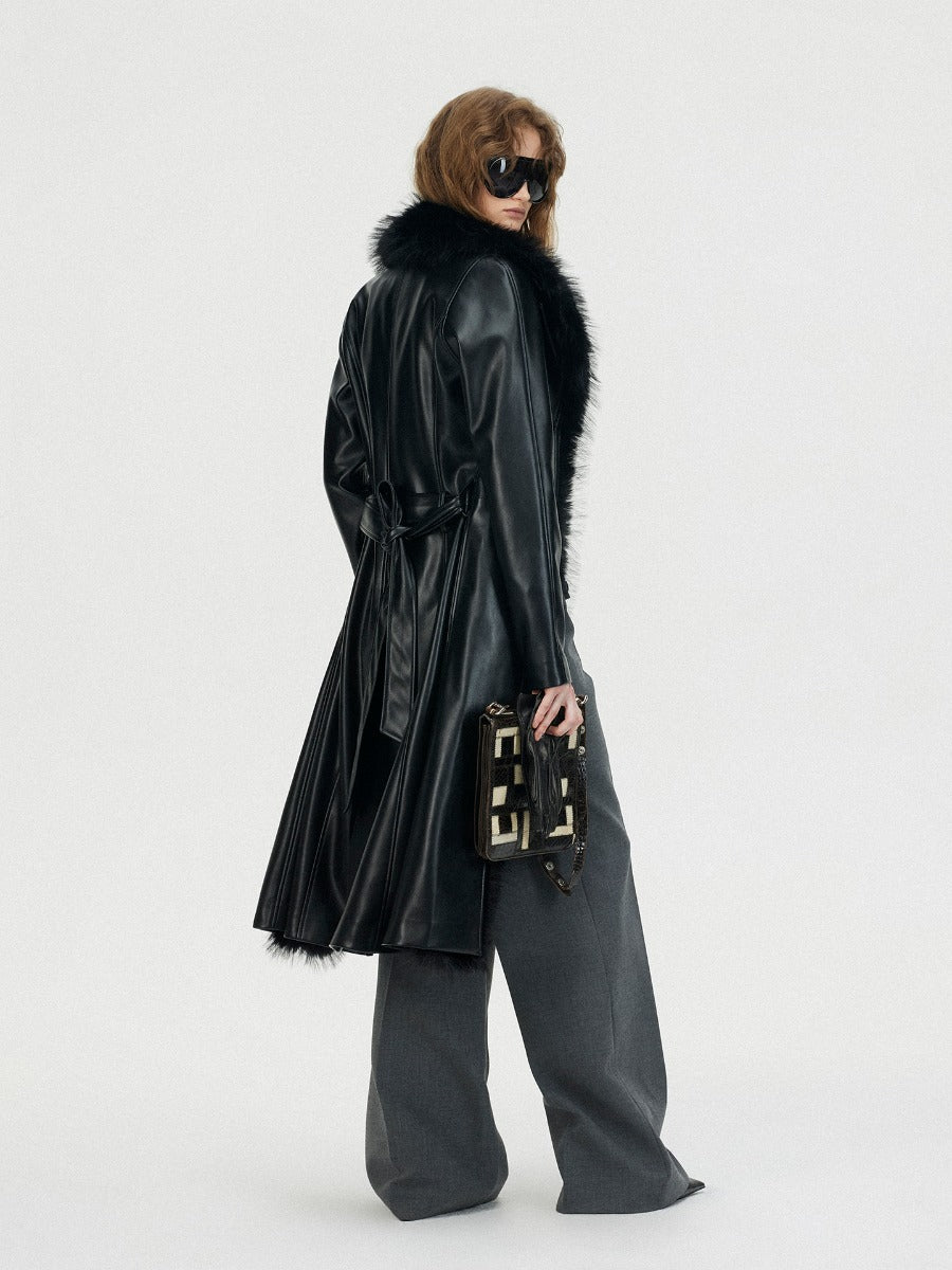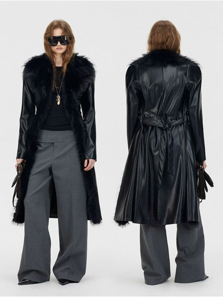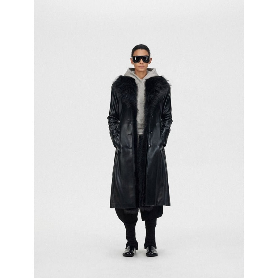 Waisted Eco-friendly Leather Trench Coat with Detachable Fur Collar「NEW」