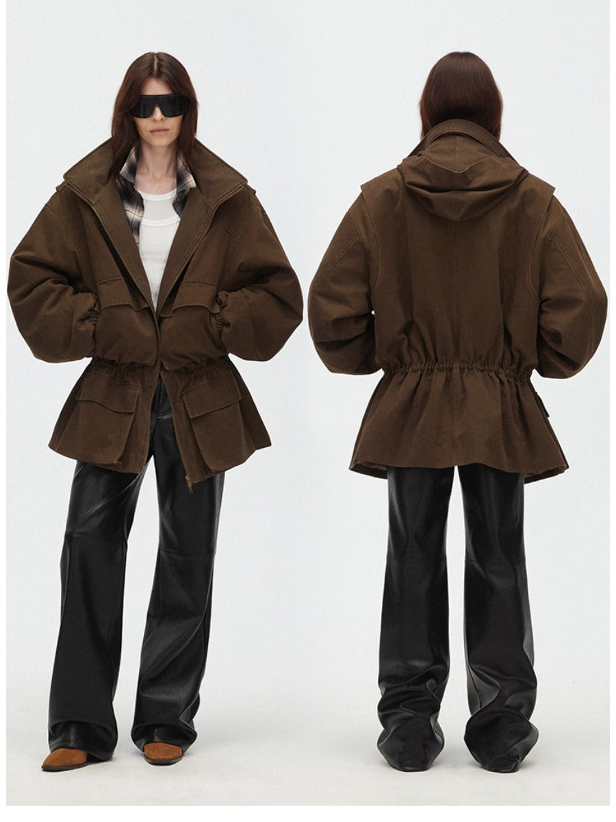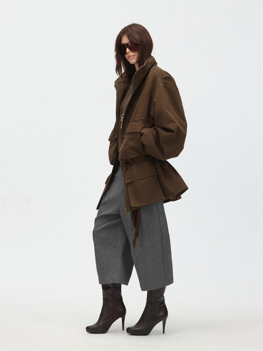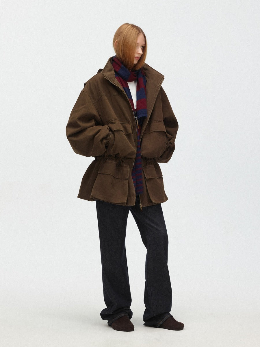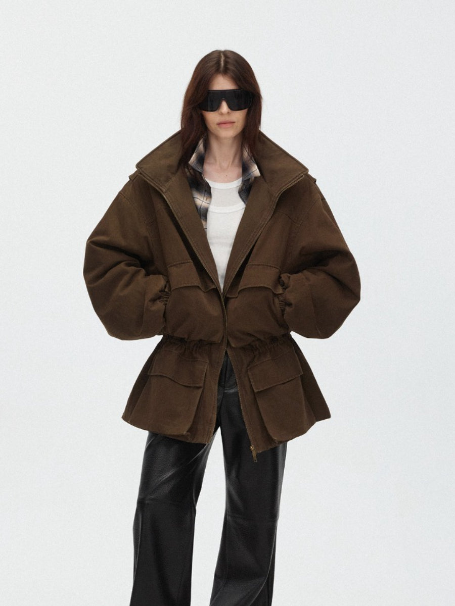 Washed Drawstring Waist Stand Collar Utility Padded Jacket