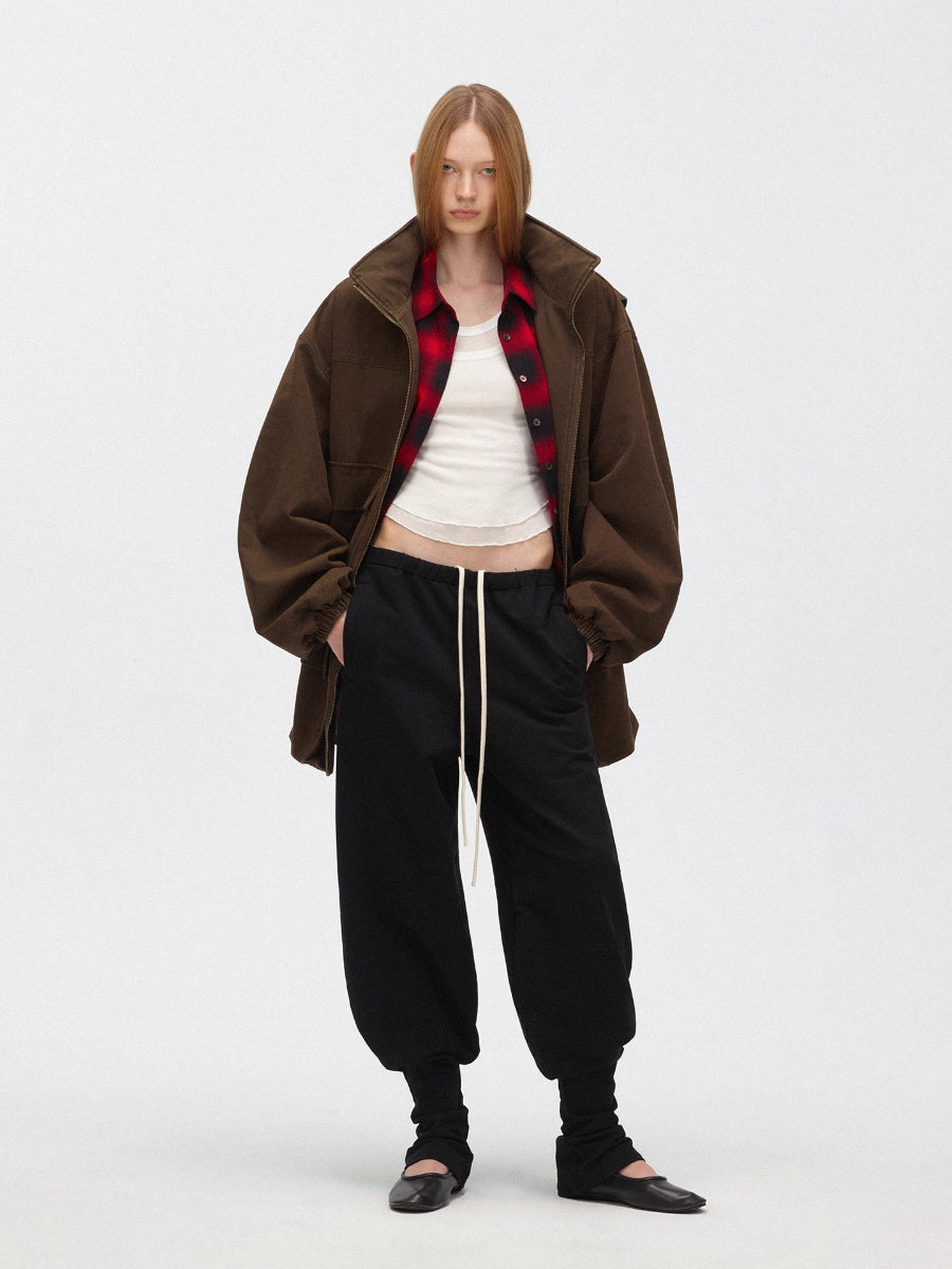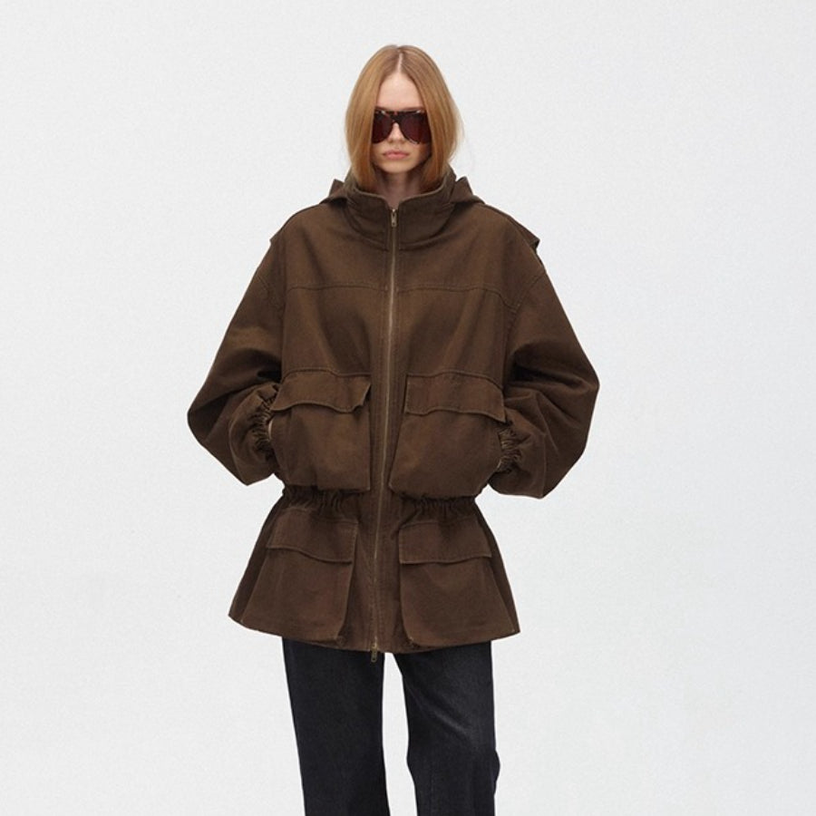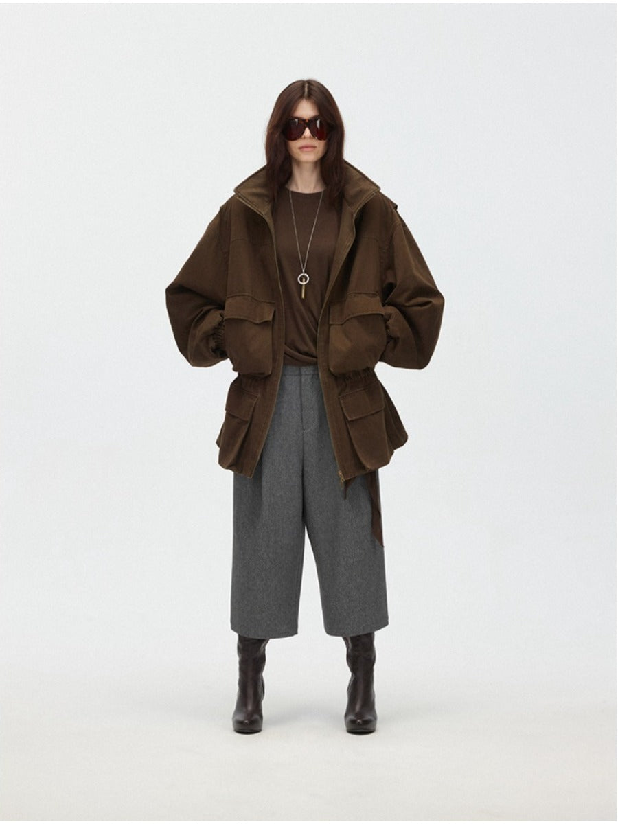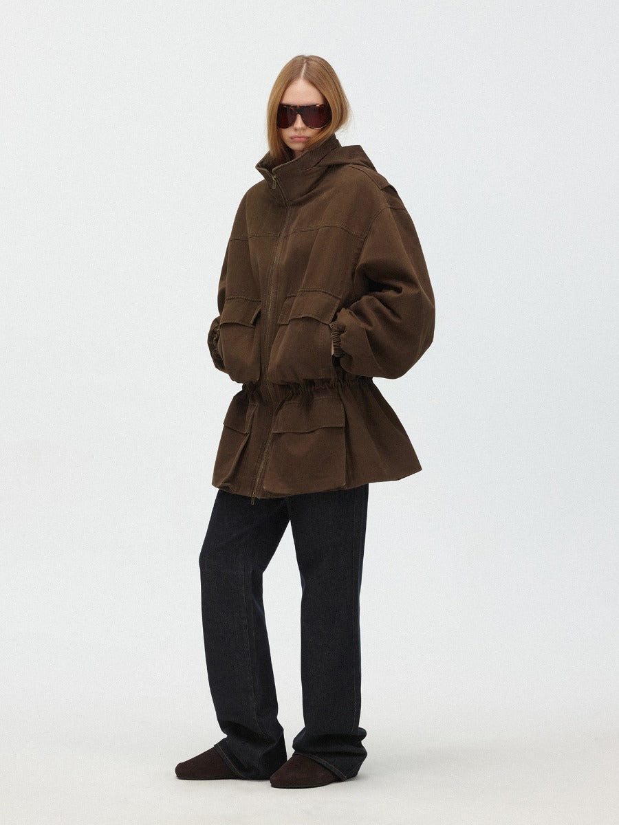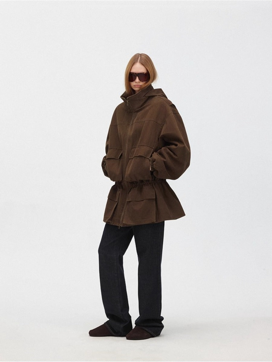 Washed Drawstring Waist Stand Collar Utility Padded Jacket